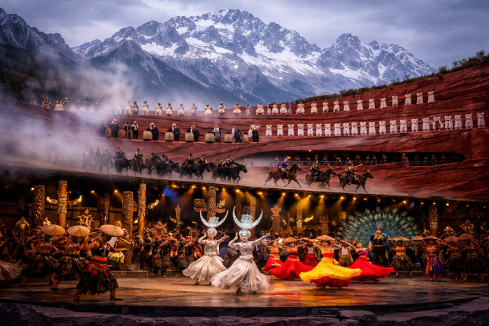 在海拔3100米的玉龍雪山藍月谷劇場進行,利用雪山作為天然背景,結合當地納西族等十個少數民族的民俗風情,展現茶馬古道、祭天祈福等主題,以粗獷自然的表演風格和質樸的歌聲,帶給觀眾心靈震撼。