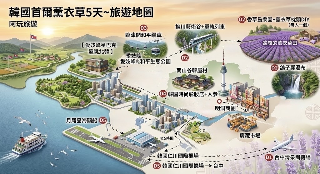 六月端午佳節,阿玩旅遊邀您飛往首爾避暑去!漫步在「香草島樂園」的紫色薰衣草田,親手製作療癒薰衣草枕;搭乘單軌列車穿梭「抱川藝術谷」,並在「愛妓峰星巴克」遠眺北韓。全程安排精緻素食料理,享受最純粹的仲夏時光。